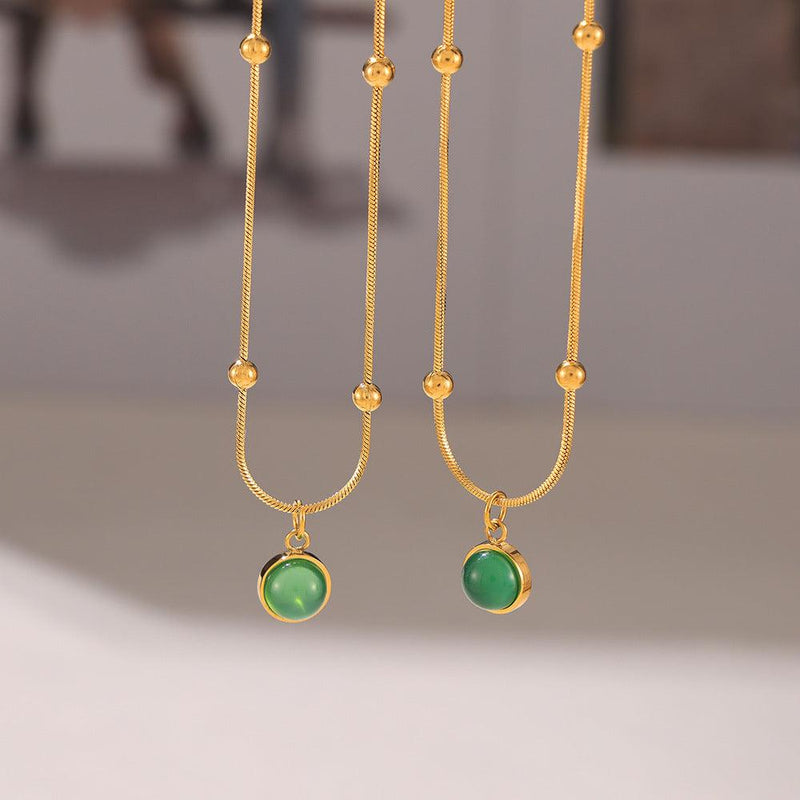 B廠-法式復古綠石吊墜圓珠鎖骨項鍊小眾簡約疊戴風不鏽鋼鍍18k金飾品「P1878-P1694」24.07-3