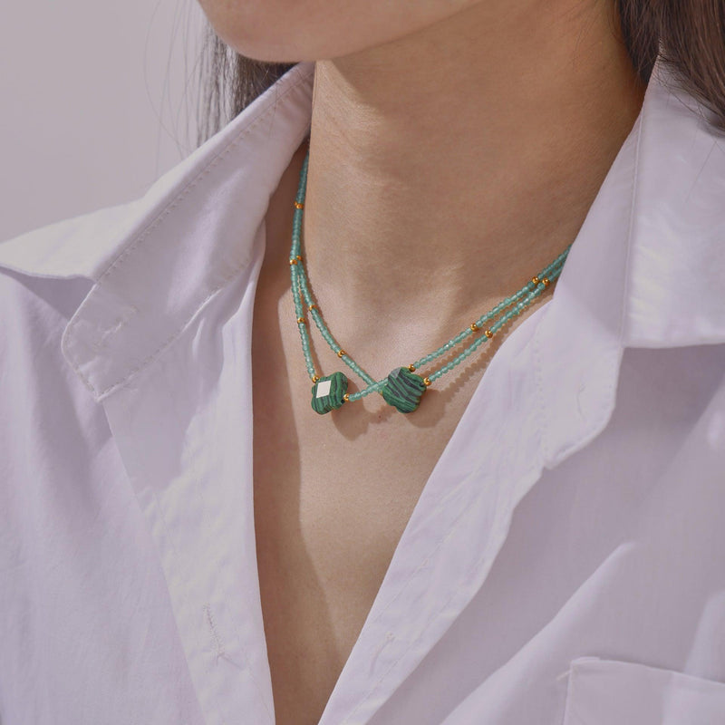 B廠-法式復古孔雀石花朵吊墜小眾個性ins風天然石鋼珠串珠優雅項鍊女「P1851」24.07-1