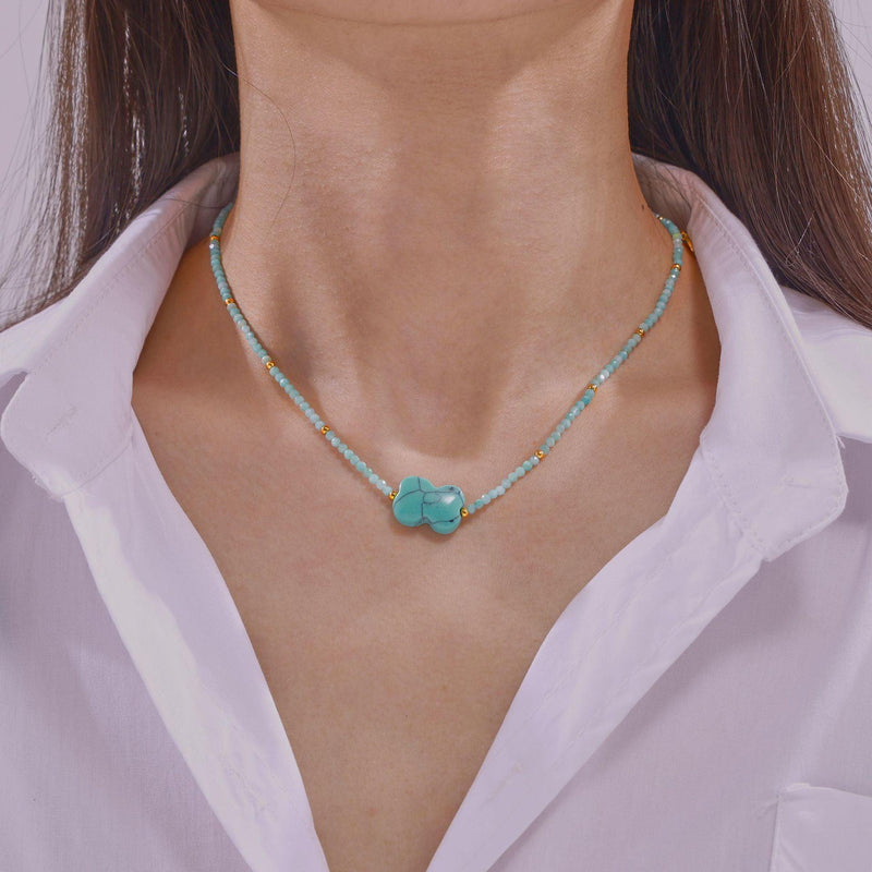 B廠-波西米亞新款設計綠松石吊墜時尚百搭個性天然石鋼珠串珠項鍊飾品「P1850」24.07-1