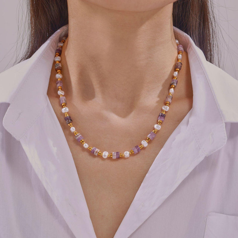 B廠-vintage法式復古飾品天然石貝珠串珠配飾紫色水晶鈦鋼圓珠項鍊「P1849」24.07-1