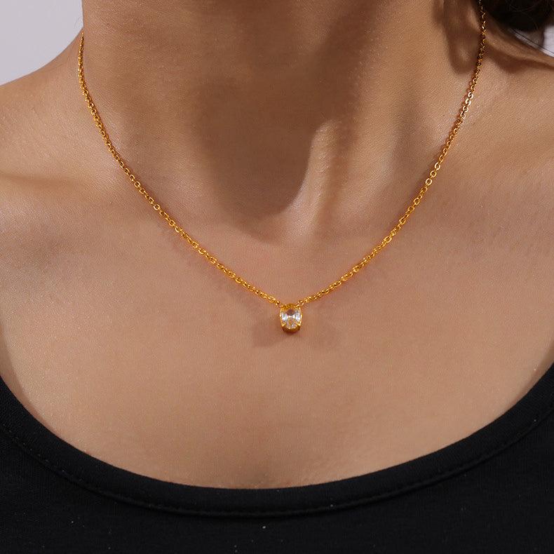 B廠-小眾法式潮流百搭通勤風橢圓鋯石簡約鈦鋼項鍊18k金單鑽氣質飾品「P1833」24.06-1