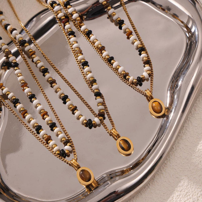 B廠-天然石串珠虎眼石橢圓吊墜項鍊女小眾輕奢復古雙層疊戴鈦鋼鎖骨鏈「P1831」24.06-2