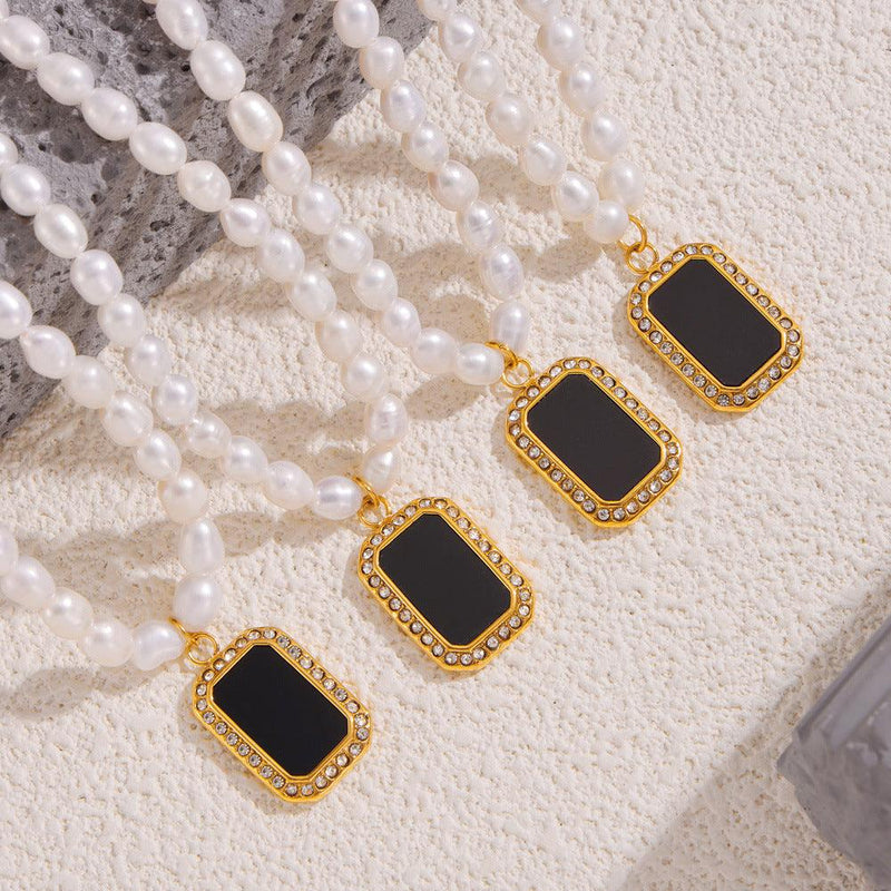 B廠-跨境韓版新品復古氣質名媛風鑲鋯石項鍊網紅淡水珍珠鈦鋼鍍金頸鏈「P1837」24.06-3