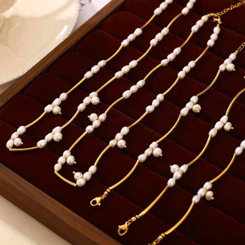 B廠-時尚通勤簡約百搭鈦鋼鍍金套裝小眾風淡水珍珠設計溫柔手鍊項鍊女「E013-P013」24.04-3
