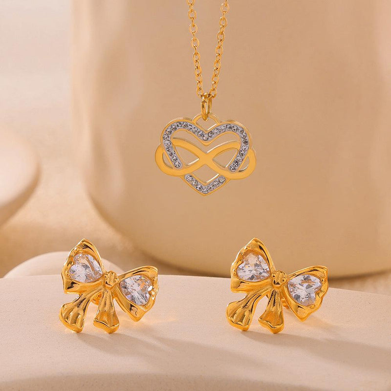 B廠-歐美復古桃心纏繞吊墜女金色鑲鑽蝴蝶結耳環鏤空鈦鋼項鍊耳飾批發「F016-P023」24.04-2