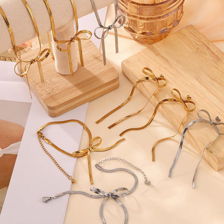 B廠-歐美跨境熱銷BowEarring蝴蝶結飾品小眾金屬ins風設計首飾套裝女項鍊耳環手鍊「E006-F006-P006」24.04-3