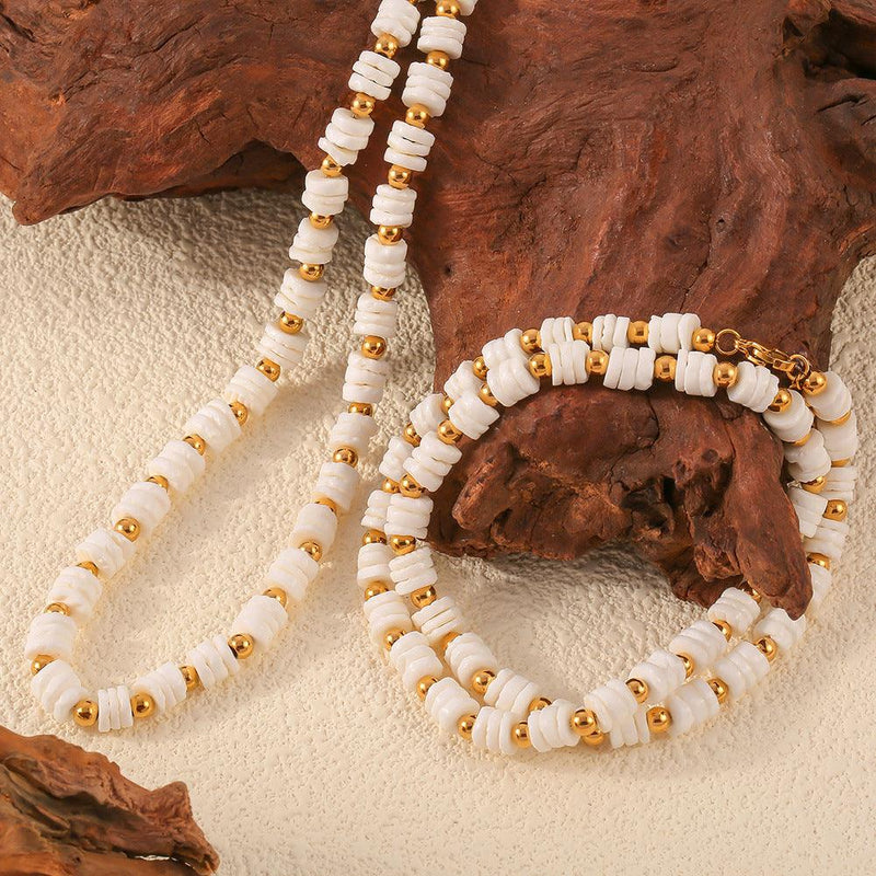B廠-法式ins冷淡風小眾優雅輕奢飾品貝殼串珠鈦鋼鍍金手鍊項鍊套裝女「P1983-E231」24.05-1