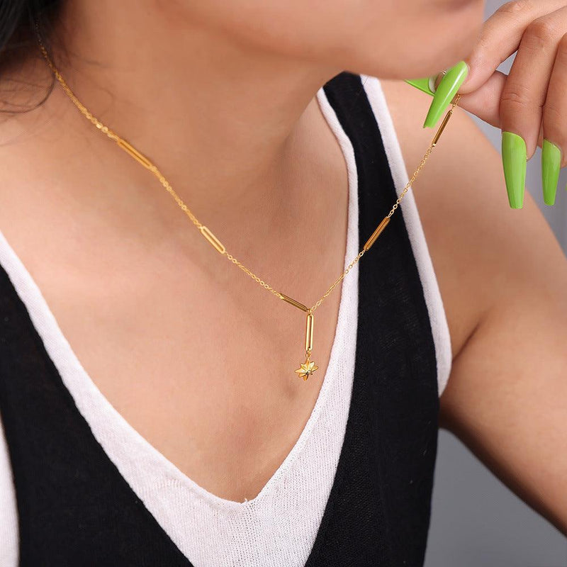 B廠-新款簡約米字鑲鑽吊墜ins八芒星項鍊女小眾輕奢設計感鈦鋼鎖骨鏈「P1000」24.08-3