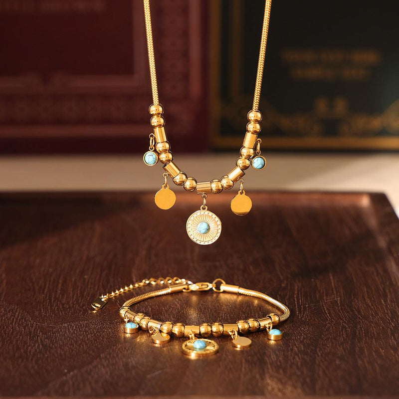 B廠-跨境歐美藍松石圓牌吊墜項鍊手鍊小眾時尚輕奢配飾鈦鋼鍍18k真金「TXP082-TXE082」24.08-3