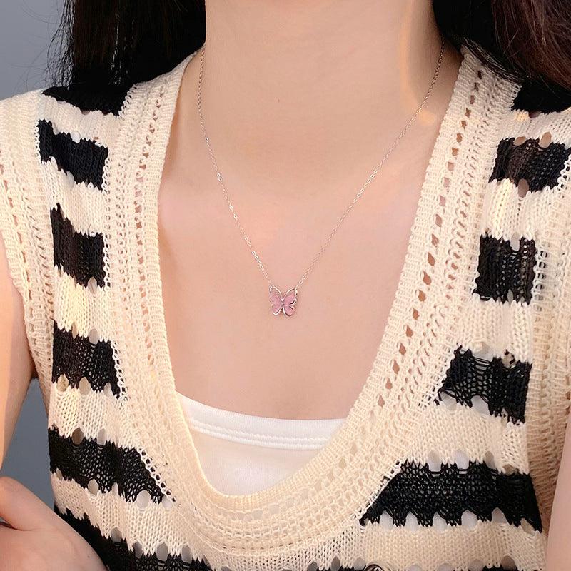 D廠-S925純銀甜美粉鑽鏤空蝴蝶項鍊女清新小眾設計感少女心鎖骨鏈「YC3736N」24.05-3