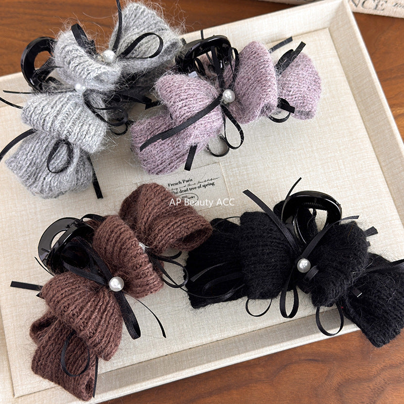 E廠-秋冬氛圍感韓系兔毛毛線珍珠絲帶蝴蝶結抓夾後腦勺髮夾精緻鯊魚夾「27667」25.11-2
