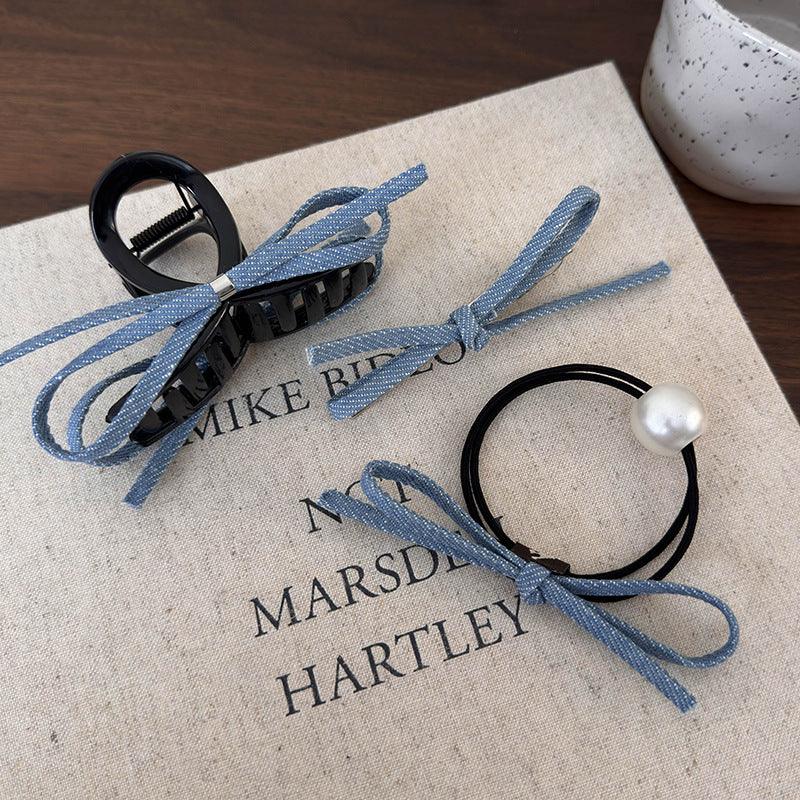 E廠-小眾藍色牛仔布藝蝴蝶結髮夾鴨嘴夾瀏海夾鯊魚夾甜美髮繩皮筋髮飾「25628」24.06-4