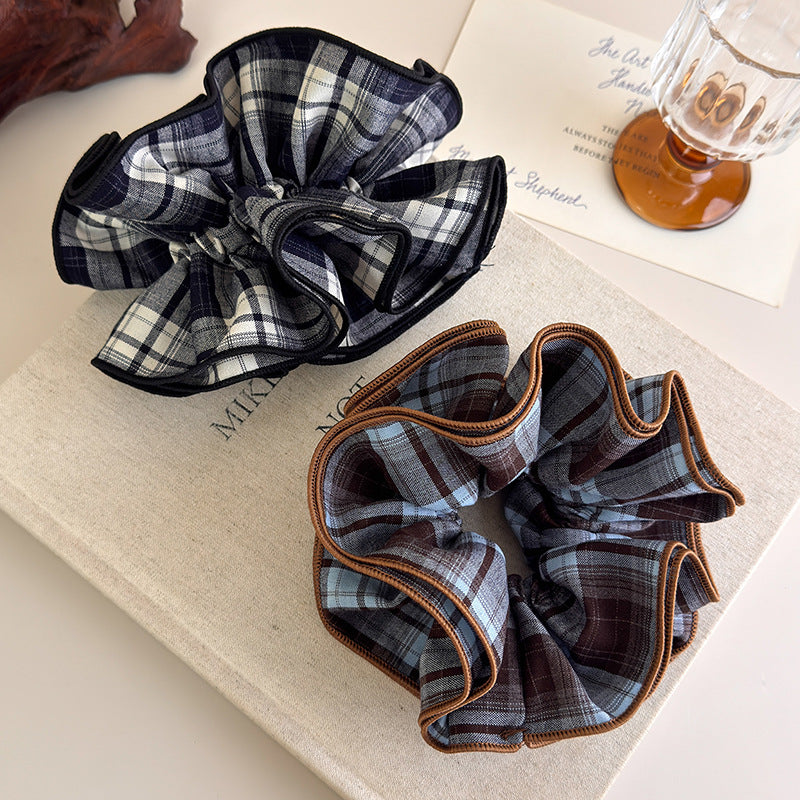 E廠-四層鎖邊格紋褶皺大腸髮圈復古學院風簡約撞色大腸圈低馬尾髮繩「27407」25.08-5