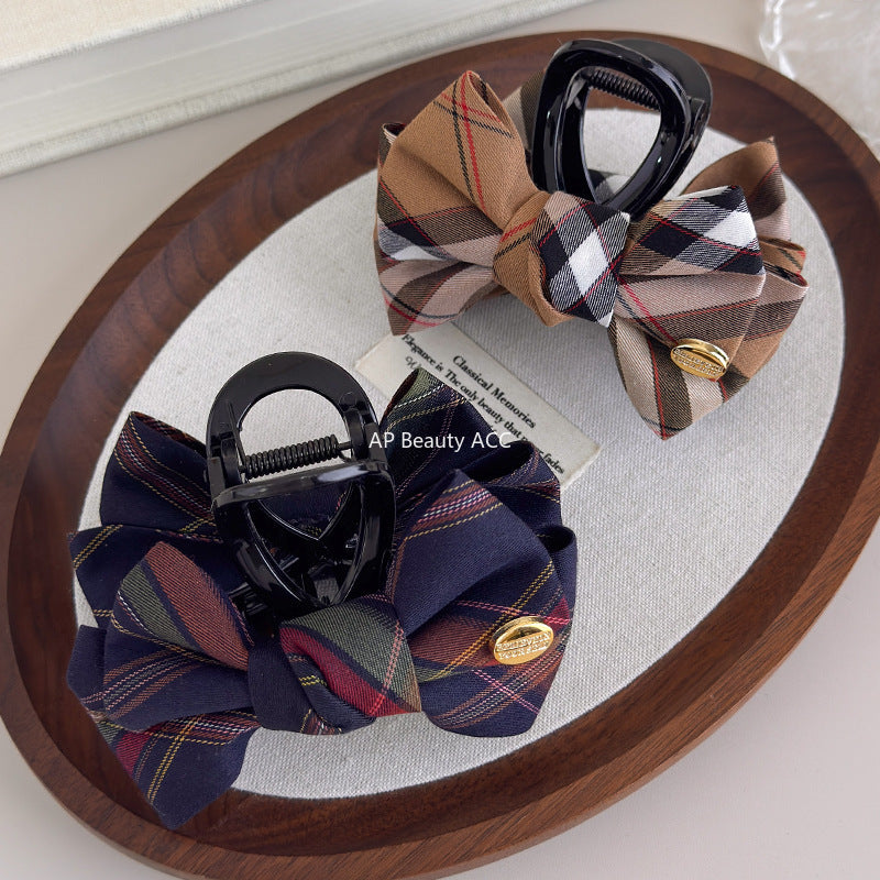 E廠-經典英倫風布藝髮抓復古格紋蝴蝶結抓夾高級感鯊魚夾盤髮夾子髮飾「27564」25.10-3