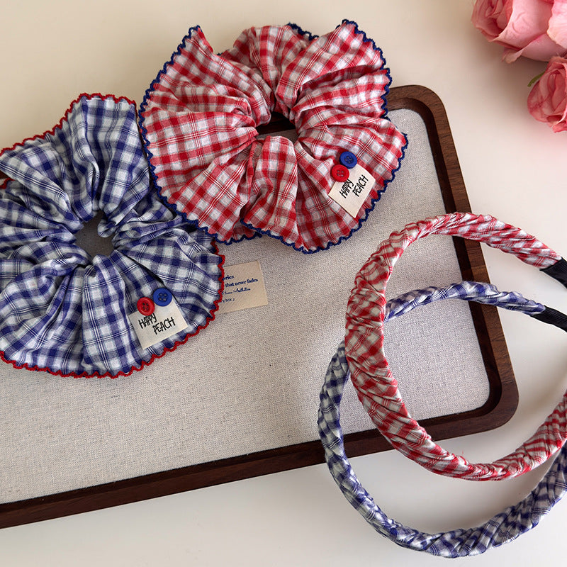E廠-2025夏秋新款紅藍格子大腸髮圈甜美紐扣格子髮圈褶皺髮箍髮飾頭飾「27215」25.07-3