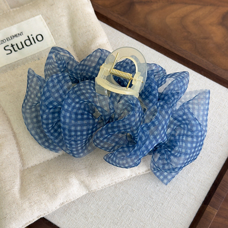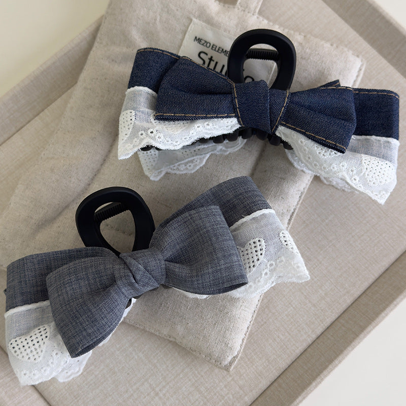 E廠-法式牛仔蕾絲蝴蝶結抓夾女新款簡約百搭後腦勺鯊魚夾大號頭飾髮飾「27078」25.06-3