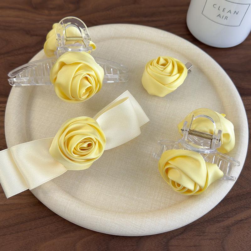 E廠-春日陽光 手工立體黃色玫瑰花朵髮夾女優雅氣質後腦勺半扎髮頭飾「26777」25.04-2