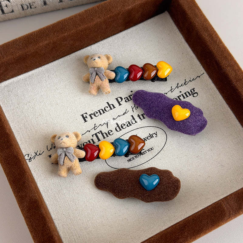 E廠-韓國新款植絨小熊愛心側邊對夾甜美少女減齡髮夾時尚可愛瀏海夾子「27596」25.10-4