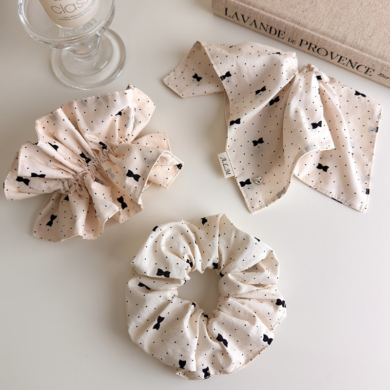 E廠-甜美米色蝴蝶結波點方巾大腸髮圈超仙溫柔韓系馬尾丸子頭布藝髮圈「27463」25.09-2