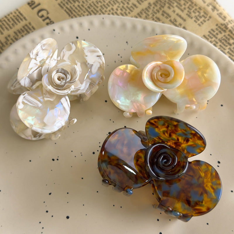 E廠-法式優雅復古山茶花朵醋酸中號抓夾女小眾氣質半扎髮夾鯊魚夾頭飾「27168」25.07-1