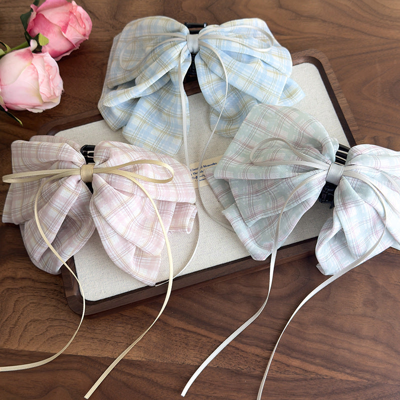 E廠-2025新款甜美格子蝴蝶結絲巾馬尾夾後腦勺夾子頭飾高級感髮飾抓夾「27132」25.06-4
