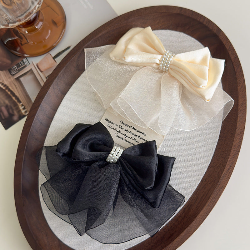 E廠-緞面歐根紗蝴蝶結頂夾後腦勺彈簧夾仙氣飄飄氣質髮夾珍珠夾子頭飾「27155」25.07-1
