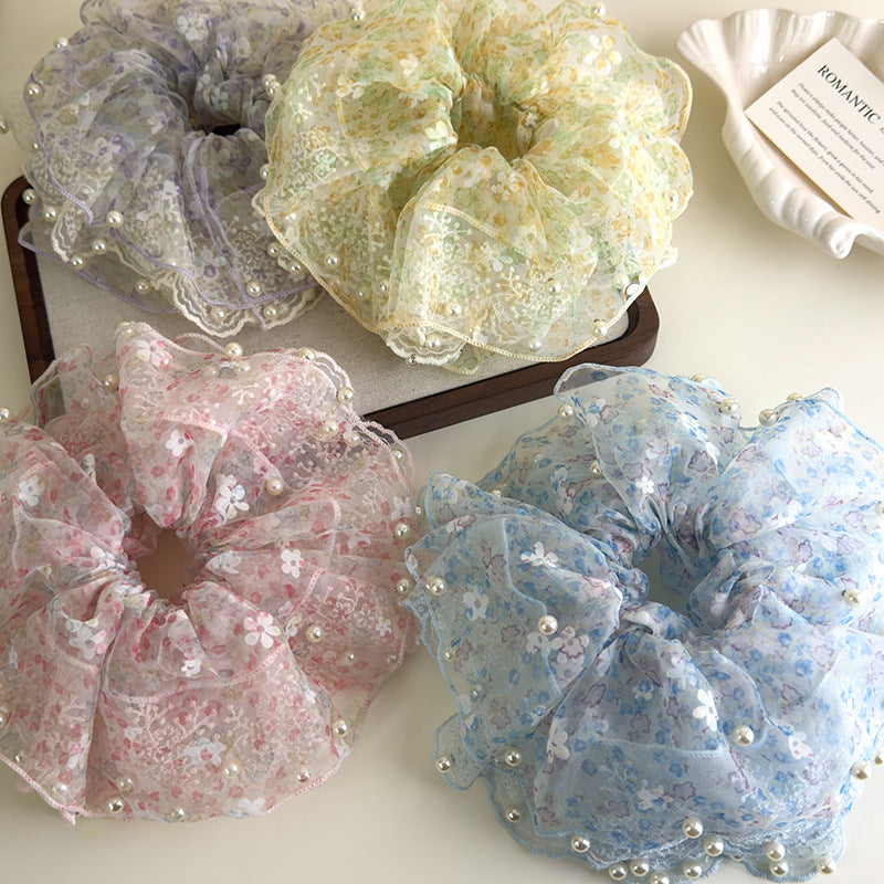 E廠-超仙蕾絲花朵珍珠大腸髮圈女高端大腸頭繩耐用皮筋精緻扎頭髮髮飾「27127」25.06-4