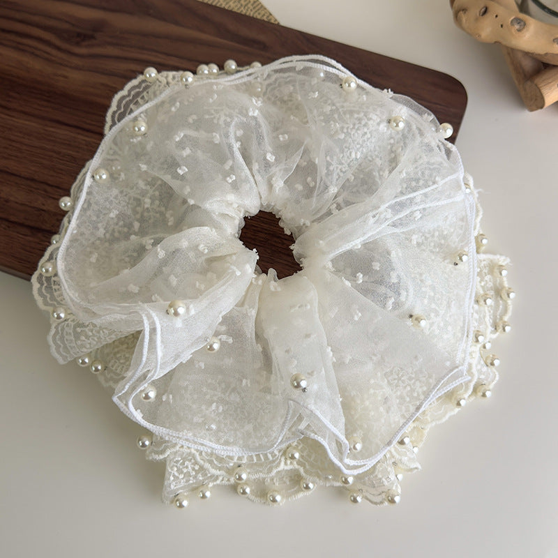E廠-白色網紗裙擺珍珠蕾絲大腸髮圈2025新款超大號扎頭髮頭花髮繩髮飾「27129」25.06-4