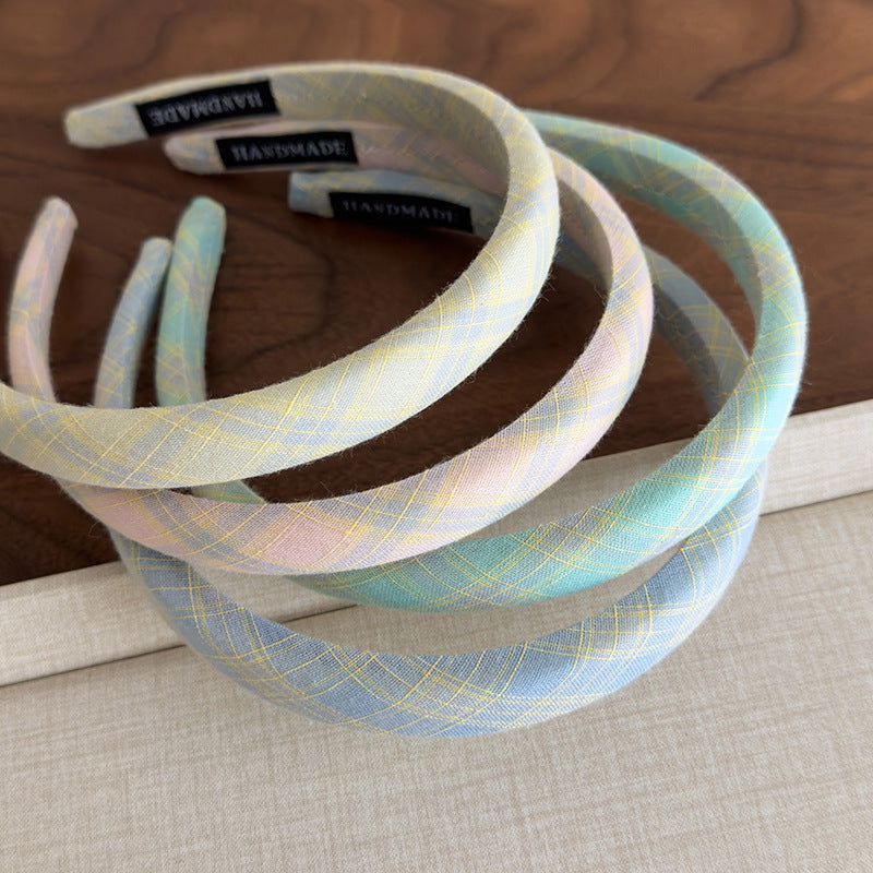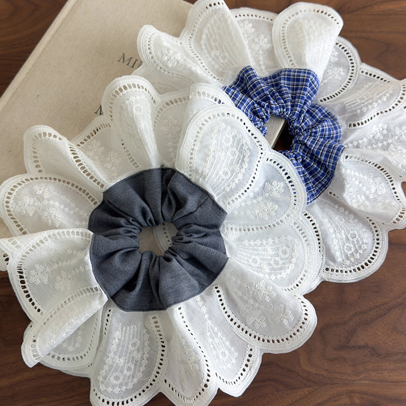 E廠-超大寬邊顯臉小拼接刺繡花朵肥腸圈韓國學院風藍白格紋鏤空髮繩女「27095」25.06-3