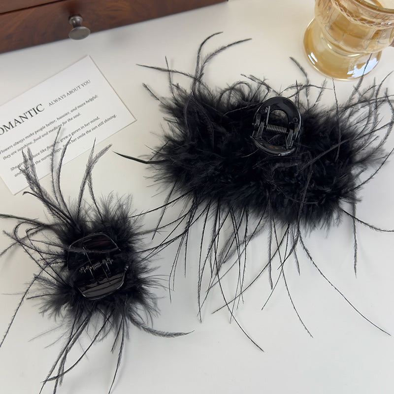 E廠-黑色羽毛高馬尾小抓夾女2025新款高級感毛毛鯊魚夾後腦勺半扎髮夾「26964」25.05-4