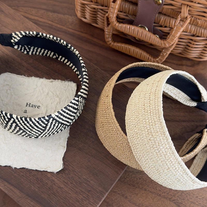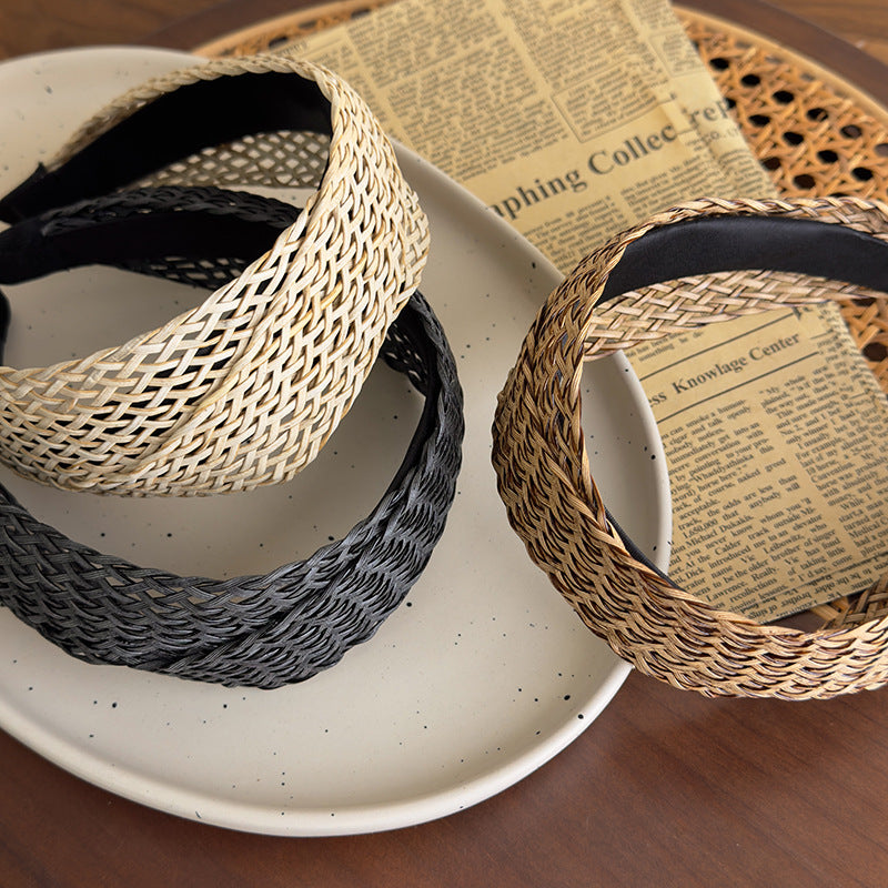 E廠-復古老錢風草編寬邊髮箍女高級感日常外戴頭箍高顱頂度假髮捆頭飾「26926」25.05-3