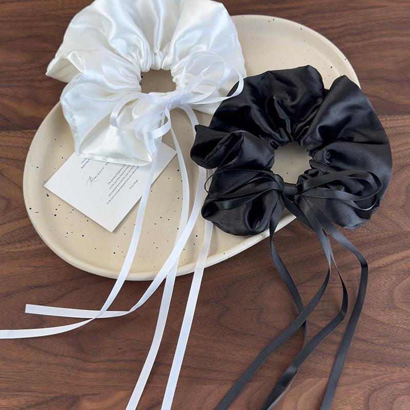 E廠-芭蕾風白色緞面蝴蝶結長飄帶大腸髮圈女馬尾扎頭髮皮筋高級感髮飾「26629」25.03-2