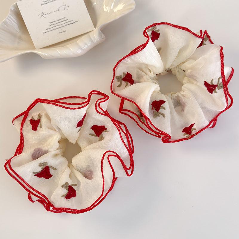 E廠-紅色刺繡玫瑰花朵大腸髮圈2025春夏新款扎髮丸子頭高端髮繩頭繩女「26652」25.03-2