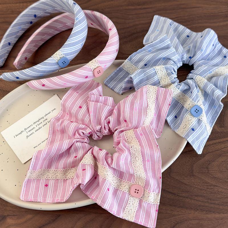 E廠-甜美色系彩色條紋紐扣蕾絲布藝髮圈髮箍時尚感扎頭髮丸子頭頭繩女「26617」25.03-2