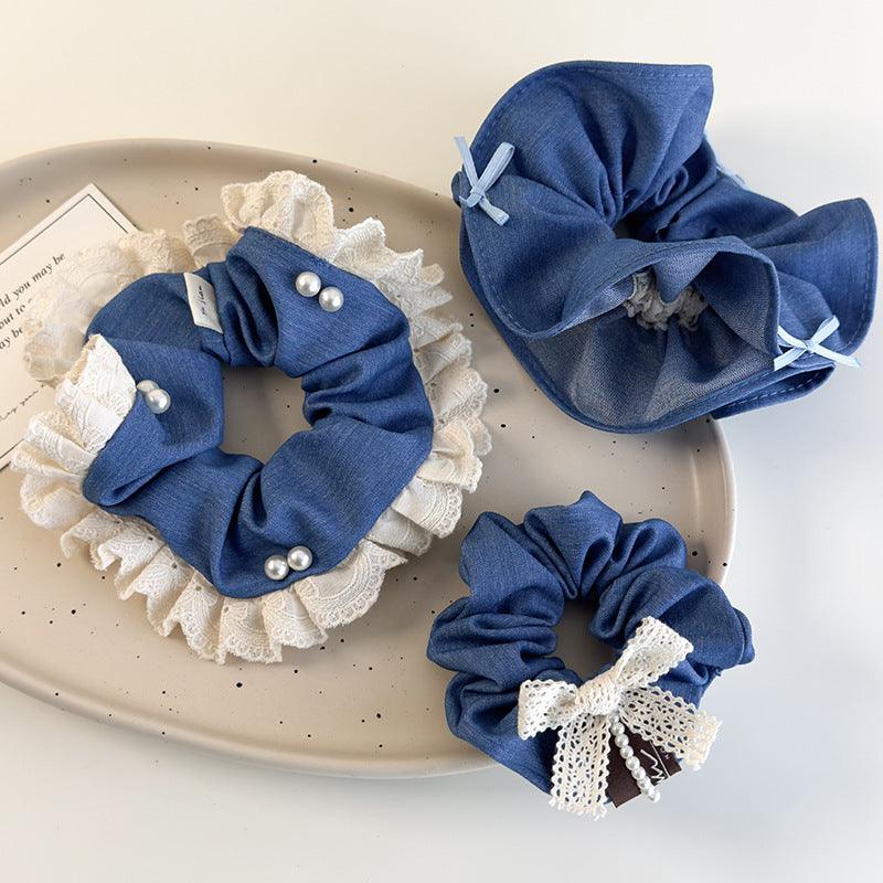 E廠-溫柔藍色牛仔色系蕾絲邊褶皺布藝裙擺大腸髮圈復古氣質丸子頭髮飾「26620」25.03-2