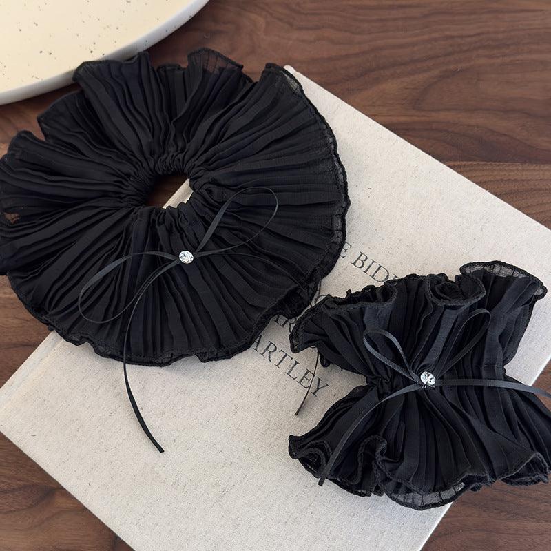 E廠-法式復古超大黑色網紗蝴蝶結水鑽大腸髮圈高級感雙層大號髮繩髮飾「26578」25.03-1