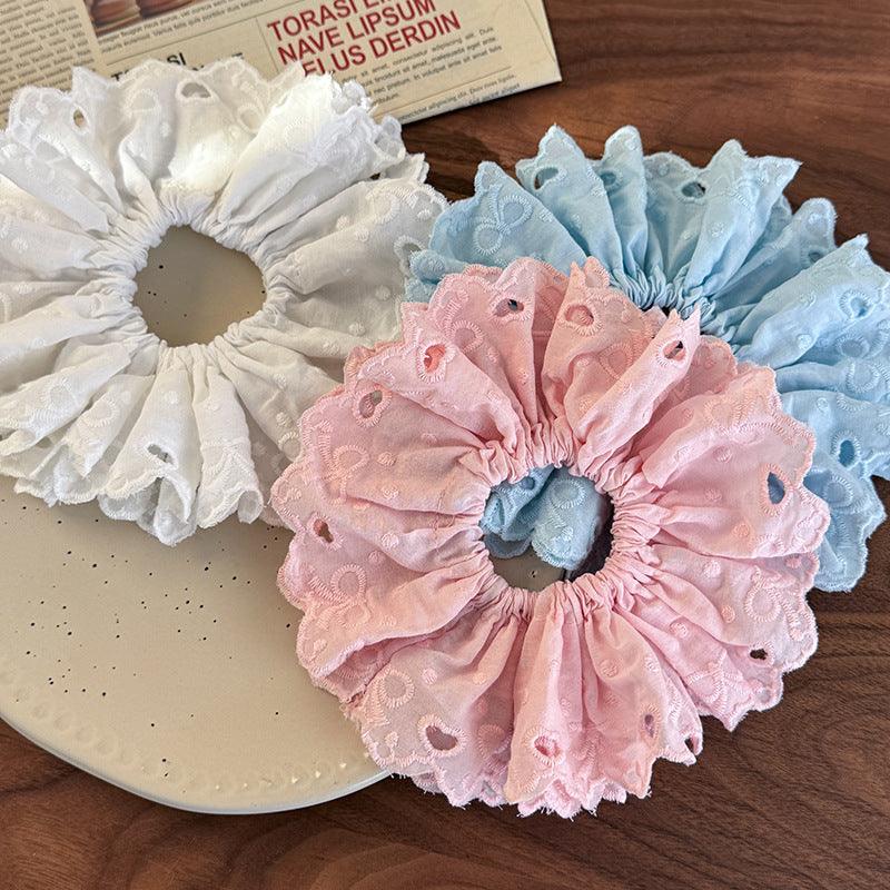 E廠-韓國小眾愛心鏤空芭蕾風刺繡蕾絲大腸髮圈重工四層馬尾大號髮繩女「26594」25.03-1