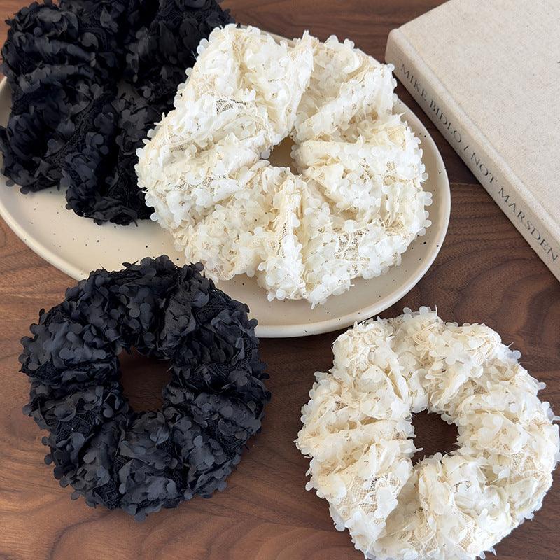 E廠-韓國春夏新款黑白花瓣立體網紗大腸髮圈ins馬尾蕾絲髮圈頭花頭繩「26588」25.03-1
