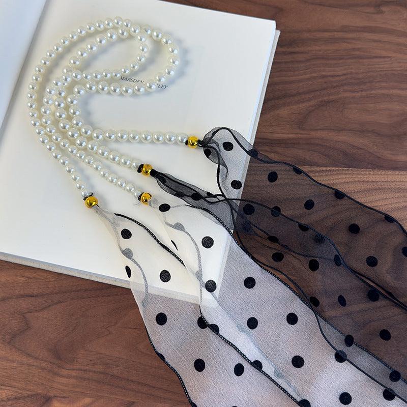 E廠-波點蕾絲珍珠髮帶絲巾綁髮女領巾2025新款薄款氛圍感飄帶氣質圍巾「26610」25.03-1