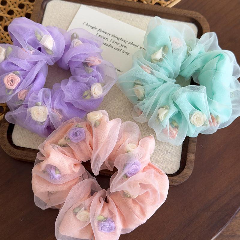 E廠-超仙大朵雙層玫瑰花朵歐根紗高級感大腸髮圈女森系甜美丸子頭頭繩「22671」25.01-3