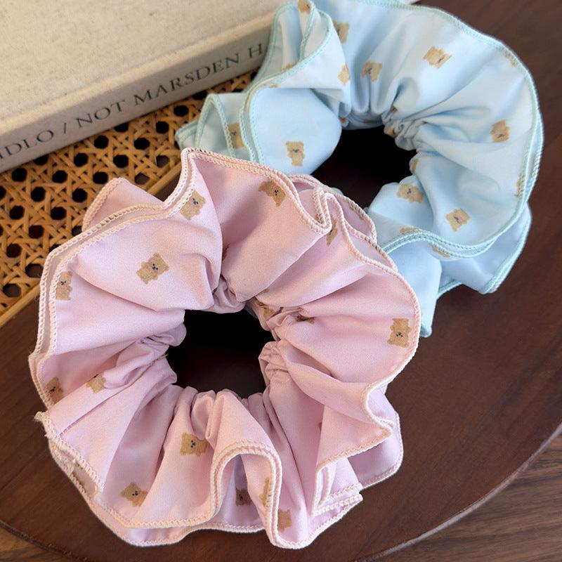 E廠-韓版新款甜美可愛小熊印花大腸圈布藝褶皺雙層扎髮頭繩後腦勺髮圈「26002」25.01-3