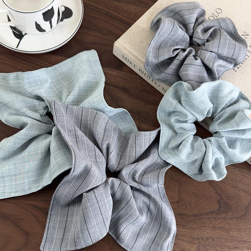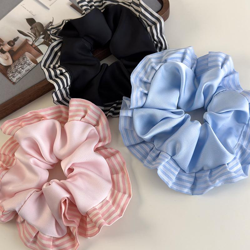 E廠-芭蕾風奶油緞面藍色粉色條紋褶皺大腸髮圈百搭裙邊髮繩扎頭髮頭繩「26485」25.02-1