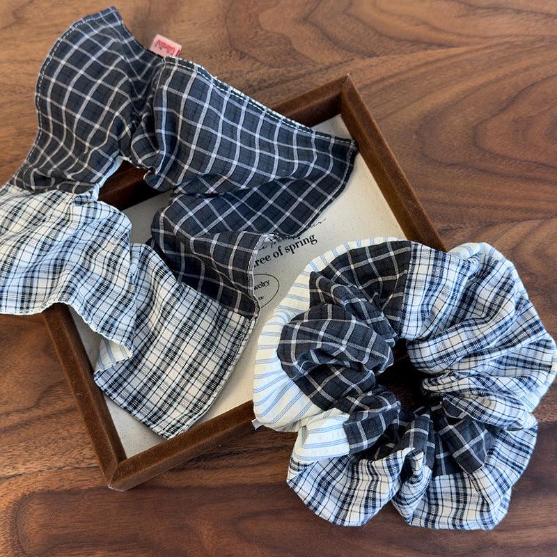 E廠-韓版雙層泡泡紗木耳邊大腸髮圈氛圍感韓系格紋紋理丸子頭馬尾髮圈「26487」25.02-1