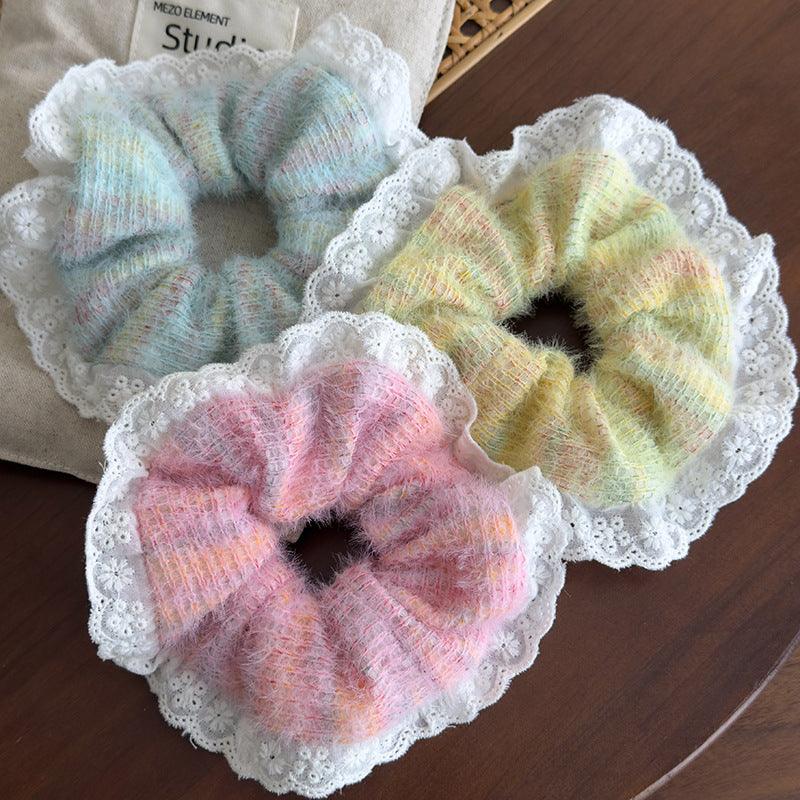 E廠-甜美少女秋冬毛絨彩色大腸法式髮圈高級蕾絲毛線馬尾髮繩頭繩髮飾「24305」25.01-3