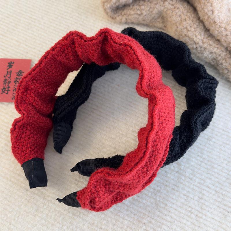 E廠-韓系網紅褶皺花邊紅色毛線髮箍女秋冬高顱頂頭箍2024新款喜慶髮飾「26406」24.12-3
