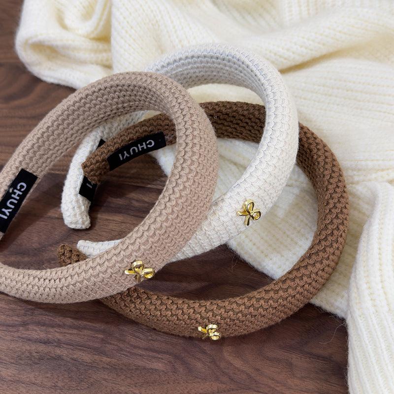 E廠-高級感咖色溫暖復古毛線編織蝴蝶結高顱頂髮箍髮飾百搭外出頭箍女「26317」24.11-5