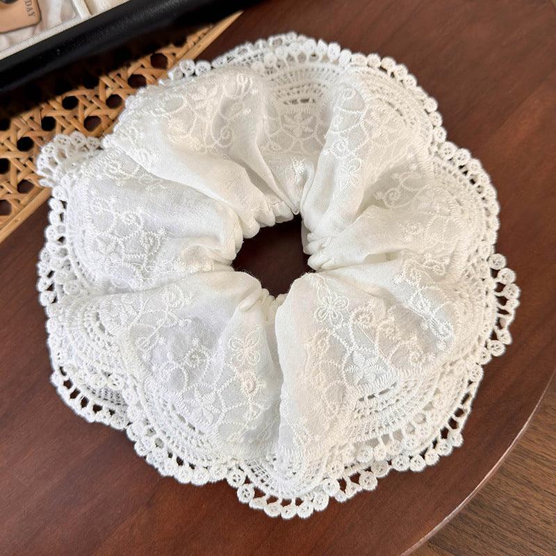 E廠-韓系溫柔白色蕾絲花邊大腸髮圈法式重工多層大號刺繡頭繩髮飾頭花「25215」24.04-2