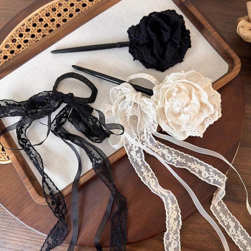 E廠-新中式超仙蕾絲蝴蝶結飄帶髮簪古風高級感木簪優雅氣質髮釵髮飾女「25311」24.04-4