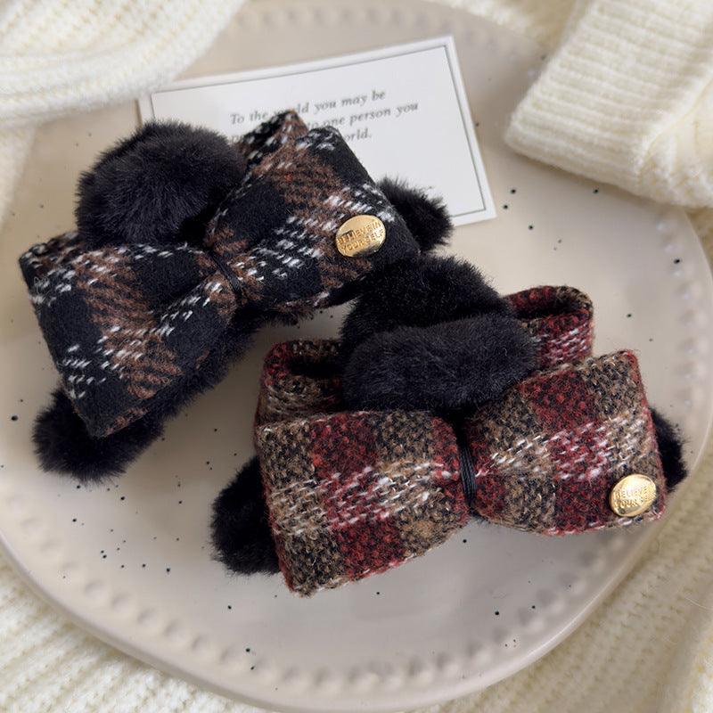 E廠-小香風毛呢格紋蝴蝶結毛絨抓夾女氣質後腦勺髮夾鯊魚夾秋冬頭飾「26333」24.12-1