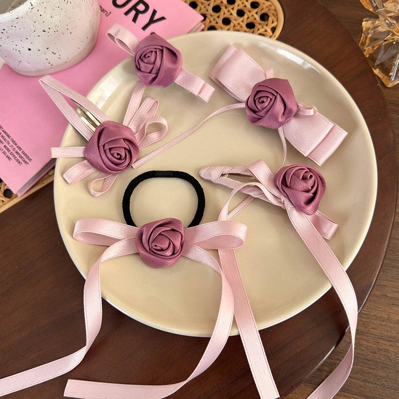 E廠-撞色粉紫布藝玫瑰蝴蝶結髮夾簡約甜美側邊瀏海夾BB夾髮圈髮飾品女「25143」24.04-1
